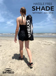 • QUICK AND EASY SETUP – can be completed solo in under five minutes – includes two quick-assemble aluminum poles and the Skybed Shade with built-in anchors – just add sand (or smooth stones)! (Pro-tip – in high winds, use the lycra elastics that come with the poles to fasten the pole-head to the sun shade!)